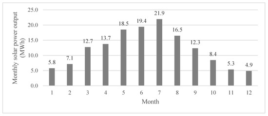 In addition to high wind profiles, southern Alberta has one of Canada’s highest solar potentials, which explains why one of the largest solar farms in North America was developed in Vulcan County in 2021 [45]. We used solar radiation and temperature information for Pincher Creek in 2017 from Canadian Weather Energy and Engineering Datasets ([44,45]) and a Canadian Solar CS6X_300P panel to calculate potential solar power output (see Figure 5). The Canadian Weather Energy and Engineering Datasets (CWEEDS) provides annual data on a range of meteorological elements, recorded hourly at a grid spacing of about 10 × 10 km grid. The solar energy outputs were calculated using the PVLIB package in Python, developed by Sandia National Laboratories [46].