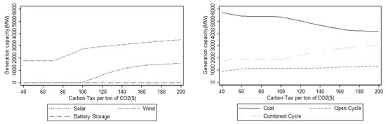 The capacities of generators with the increasing carbon tax.