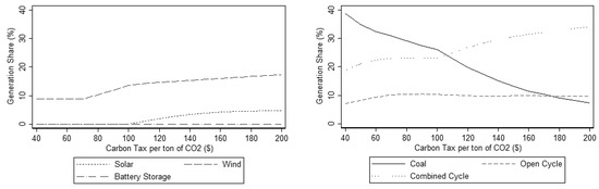 If we consider the impact of renewables on total generation, we find that renewables play a vital role in substituting for fossil-fuel generation (Figure 8). Starting from 9% in the base case, the total generation share of renewables reaches around 23% (18% from wind, 5% from solar) when the carbon tax is CAD 230/tCO2. Some 1600 MW of solar capacity is added to the base solar capacity of 15 MW, which is about half of the total wind capacity; nonetheless, the generation share of solar power is only one-third that of wind, which implies that the capacity factor of solar is lower than that of wind power. Further, the share of the generation coming from coal declines from 42% (base case) to 7% (CAD 200/tCO2 tax), but importantly, the generation share of CCGT increases from 16% to 35%. Overall, less than half of the lost generation share from coal is replaced by renewables, with more than half replaced by CCGT.