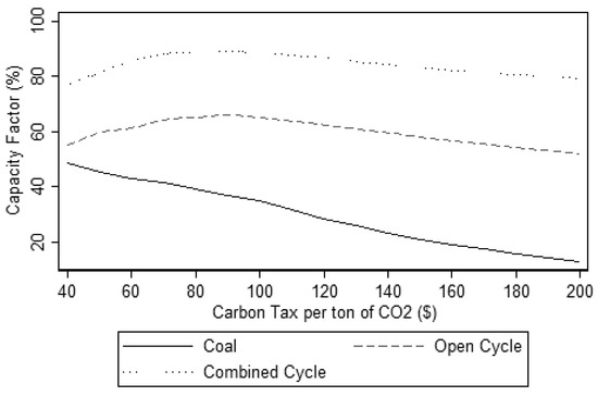 The capacity factors generators with increasing carbon tax.