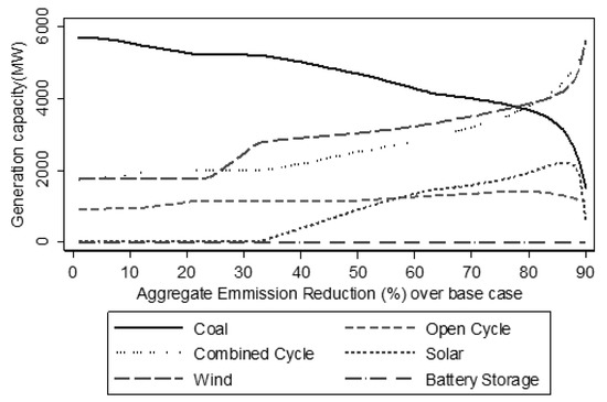 Overall, the simulation results here indicate that renewables generation could replace coal generation, but wind and solar power cannot be used as reliable baseload assets, requiring instead a large degree of CC gas capacity and generation. Further, the capacity factors of thermal generators fall because they are relied upon to generate power less often resulting in inefficient resource allocation. To improve the efficacy while meeting the carbon emission reduction goal, the electricity industry needs some reliable and less carbon-intensive alternatives to provide necessary baseload capacity. For example, many developing countries such as China and India have turned to nuclear power, with some developed countries, such as France and the Netherlands, also planning to build more nuclear power plants [47,48]).