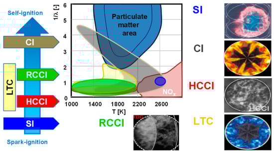 - Akihama, K.; Takatori, Y.; Inagaki, K.; Sasaki, S.; Dean, A.M. Mechanism of the smokeless rich diesel combustion by reducing temperature. In SAE Technical; SAE International: Warrendale, PA, USA, 2001. [Google Scholar] [CrossRef]