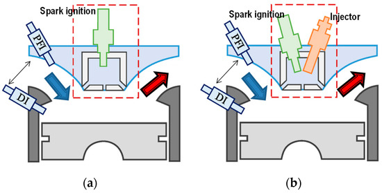 One of the measures used to reduce fuel consumption and exhaust emissions is a two-stage combustion system, turbulent jet ignition [15]. This system has been in development since the 1950s [16]. It relies on using a prechamber, which significantly improves the thermodynamic parameters of the combustion process in terms of lean mixture combustion compared to the conventional SI system or even the use of a prechamber spark plug [17]. The effects of using the TJI system depend on the geometry of the ignition chamber and the mixture formation system used [18,19]. Two systems can be distinguished in the system: a passive and active prechamber (Figure 2). In the case of an active prechamber, an additional dose of fuel is delivered directly to the spark plug area. In such a system, it is possible to use the widespread indirect injection of natural gas or direct injection, which is under development. In addition, it is possible to use both simultaneously.