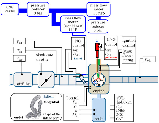 The two-stage combustion process tests were carried out according to the diagram shown in Figure 3. The AVL 5804 research combustion engine, modified for the use of gaseous fuel, was equipped with a methane supply system (in the intake duct and prechamber). The Micro Motion ELITE CMFS010M Coriolis Meter gas flow meter (with a measuring range of 0.1–2 kg/h) was used in the injection system in the intake tract, and Bronkhorst 111B (with a measuring range of 0.1–100 g/h) for small doses of gas in the prechamber. Pressure sensors were used in both combustion chambers (in the main chamber: AVL GH14D; and in the prechamber: Kistler M3.5). Engine operating parameters were recorded using the AVL IndiSmart system (with a resolution of 0.1 deg CA).