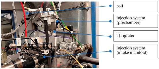 The engine was equipped with two injection systems (Figure 4) supplied at a pressure of p = 8 bar to the intake system (PFI) and 3 bar to the prechamber (DI). The pressure was differentiated due to the requirements as to the size of fuel doses delivered separately to the PC (preliminary chamber) and MC (main chamber). A constant start of fuel injection was established at the angle α = 240 deg bTDC (for both injectors). The fuel dose was controlled by the injection time, which was significantly greater when injected into the intake port. Figure 4 shows the location of the two injectors (to the prechamber and to the inlet channel).