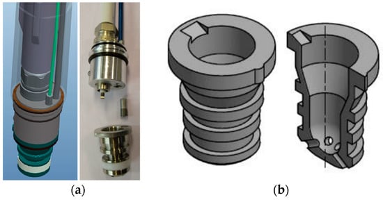 The combustion chamber was equipped with a prechamber with a volume of 2.29 cm3. This value accounted for 0.45% of the total engine stroke volume (at BDC) and 6.6% of the capacity (at TDC). The prechamber was equipped with an M10 spark plug and a gas supply (Figure 5a). The prechamber had 6 holes as shown in Figure 5b. Other sizes of the prechamber are listed in Table 1.