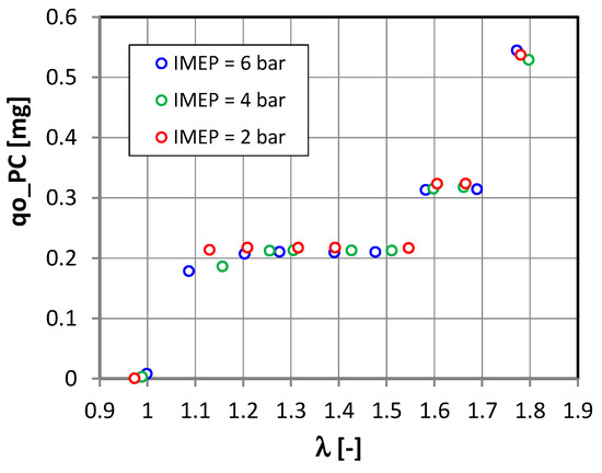 The tests were carried out with a constant fuel dose (Figure 6) and a varied air dose (adjustable throttle), regardless of the average indicated pressure value. Such variability of the tests made it possible to evaluate the engine efficiency, the increase in which indicated an improvement in the combustion process. Preliminary studies have found that increasing the prechamber dose in the lean mixture range contributes to the improvement of the combustion process quality, as well as to the assumptions presented in Equations (1) and (2). Regarding the combustion of near-stoichiometric mixtures, fuel dosing to the PC deteriorated engine operation.