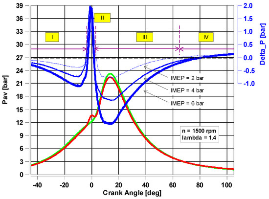 At low values of the IMEP values, the mixture flowed into the main chamber (phase I in Figure 8). Then, during compression, it flowed into the prechamber (phase II in Figure 8). Ignition of the mixture in the prechamber caused the mixture to flow into the main chamber. In the final phase of the outflow, the pressure in the prechamber reached higher values than in the main chamber (phase IV; Figure 8). Increasing the average IMEP did not change the nature of the flow. However, an increase in IMEP caused an increase in the pressure difference (Delta_P; Figure 8). Based on the flow analysis, it was found that increasing IMEP caused an increase in the pressure difference, while maintaining a constant pressure in the prechamber (area II; Figure 8). A small angular change in the flows resulted from the need to maintain a constant CoC value (Equation (2)).