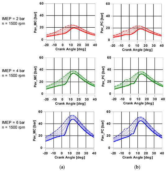 A complete analysis of the pressure curve in the cylinder is shown in Figure 9. As previously mentioned, the excess air ratio was adjusted by changing the amount of intake air (at a constant fuel dose). The thick line shows the changes in pressure in the cylinder at λ = 1.0. The dashed line indicates the pressure in the cylinder at λ = 1.8. Points (a) and (b) mark the course of pressure in the cylinder (MC) and in the ignition chamber (PC), respectively. There is an apparent shift in the prechamber start of combustion towards earlier ignition angles in order to maintain a constant CoC value.