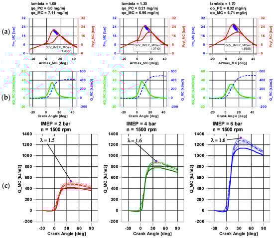 The analysis of the heat release rate indicates the best combustion process curve (among those presented) at λ = 1.3 (Figure 10b). As the excess air coefficient increased, higher values of the amount of released heat could be observed. This indicated an increase in the overall engine efficiency, which at the same time indicated the possibility of reducing fuel consumption. This reduction in fuel consumption resulted from the high value of the excess air coefficient and the simultaneous increase in the amount of heat released. The heat release rate curve for all IMEP values and its maximum value are presented in Figure 10c.