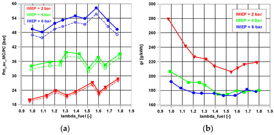 The cylinder peak pressure analysis (averaged over 100 work cycles; Figure 11a) indicated that the maximum value was obtained with an excess air coefficient between 1.3 > λ > 1.6. The fact that lower values could be observed for the prechamber is characteristic for this setup. This was also confirmed by the data in Figure 8. The comparison of the specific indicated fuel consumption (Figure 11b) pointed to the existence of a minimum for lean mixtures in the range of 1.5 < λ < 1.6. An increased engine load indicated a specific indicated fuel consumption of less than 180 g/kWh. This means that the maximum motor efficiency values could also be expected in this range.