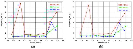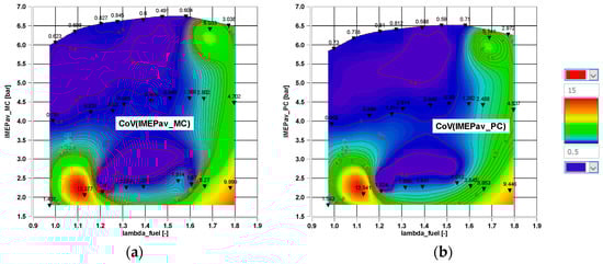 In Figure 12, the CoV(IMEP) peaks at λ = 1.1 are visible, which are not visible in Figure 14. This is due to the way the map in Figure 14 was created, which contains only one point with a CoV(IMEP) value > 12%. Such a point does not provide grounds for determining large areas with high CoV(IMEP) values present at low engine loads. Several values in a similar load range already significantly affect the map image, CoV(IMEP) values at a high value of λ and high load (Figure 14b).