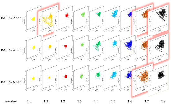 The reverse map version enabled the imaging of successive cycles, and the coefficients of variation were quantified only by the result of this dispersion. For this reason, maps make it possible to “track” uneven and variable engine operation. A large scattering of successive work cycles caused the areas in Figure 12 to occupy more space. For this reason, the largest scatters of the maximum combustion pressure values are additionally marked. It shows that a large variability in these parameters especially occurred in the range of low load and high excess air coefficient values (IMEP = 2 bar). Large variability values also occurred at other values of IMEP. The figure is only a qualitative view of the issue of engine operation stability. Therefore, a detailed analysis in the form of a two-dimensional system was not performed.