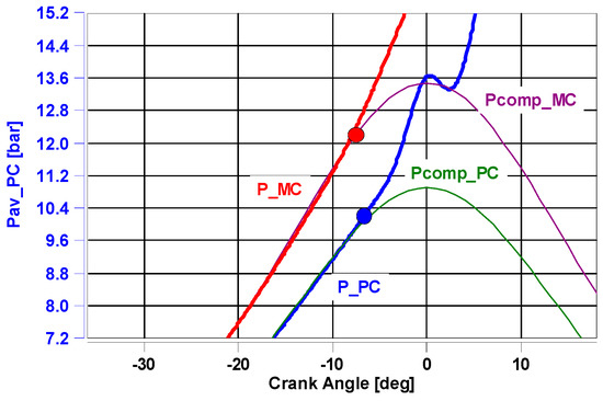 In order to avoid the incorrect determination of SOCPC (start of combustion in prechamber), it was proposed that the start of combustion in both chambers should be defined as a 2% increase in the pressure value from the theoretical line of compression pressure in both chambers: