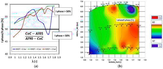 The combustion center calculated as described in Equation (3) also allowed the determination of the 5% heat release (AI05) and 90% heat release (AI90) values. These values, once obtained in this way, allowed the determination of the first and second phases of combustion. The ratio of phase I to phase II made it possible to indicate the longer combustion phase. The comparison of the combustion phases in relation to the mixture composition showed that the first phase was longer than the second (Figure 17a). Only at the smallest load value of IMEP = 2 bar and at λ = 1 was the duration of the first phase shorter than the second. With increasingly leaner mixtures, the duration of the first phase of combustion rose. This was mainly due to the prechamber mixture becoming leaner, resulting in impeded flame development. The above also caused a slower discharge of the burning mixture into the main chamber. A decrease in the duration of the first phase was observed at a high engine load. The reflection of this phenomenon was also observed in the full characteristics analysis (Figure 17b). In the area of high load and high value of λ, an area with a limited duration of the first phase (less than 50%) was observed.