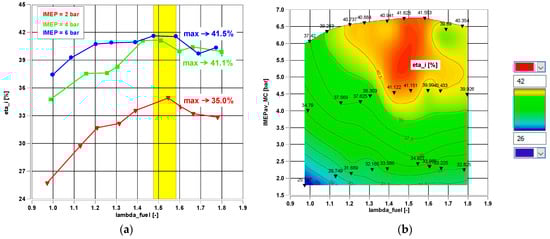 The indicated efficiency of the analyzed engine load values increased as the fuel mixture became leaner (Figure 18a). The maximum indicated efficiency was obtained in the range of 1.5 < λ < 1.6. These values were independent of the engine load. It follows that the two-stage combustion system powered by a natural gas (pure methane) achieved the highest indicated efficiency of about 42% at a high load and λ = 1.5. This means that despite the mixture being leaner, it was possible to obtain the highest efficiency of the whole system. The engine operation at low load also achieved the highest efficiency (ηi = 34.5%) at λ = 1.5. After exceeding the value of λ > 1.6 at each load value, the indicated engine efficiency decreased. This means that the prechamber used in the tests enabled the combustion of lean mixtures with high combustion efficiency for the value of λ = 1.5.