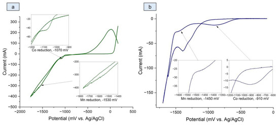 To determine whether co-electrodeposition of cobalt and manganese is possible, cyclic current–voltage curves were obtained for aqueous solutions containing ions of the corresponding metals (Figure 1a).