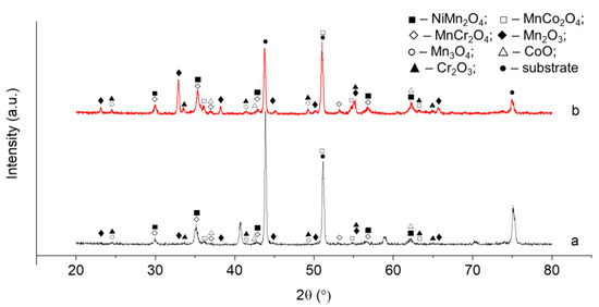 XRD pattern of Cr-Fe steel sample with deposited protective coating after vacuum (a) and oxidizing (b) annealing. The following PDF2 cards were used: NiMn2O4—00-084-0542; MnCo2O4—00-084-0482; MnCr2O4—00-075-1614; Mn2O3—00-073-1826; Mn3O4—00-075-1560; CoO—00-075-0418; Cr2O3—00-082-1484.