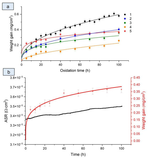 Figure 4b presents the dependence of the electrical resistance of the coated Fe-Cr steel sample on the exposure time. As is seen, the resistivity of the sample slightly increases from 3.36 to 3.50·10–3·Ω·cm2, which might be explained by the coarsening of the coating microstructure, leading to the degradation of the electrical contact [12]. Comparable electrical resistivity values were obtained for similar coatings deposited to chromium steels and alloys E-Brite [41], AISI 430 [42], and Crofer 22 APU [32,43] and nickel alloys 33NK and 47ND [28].