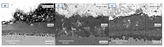 The microstructure of coatings was studied using cross-sections of samples. Coated steel samples were immersed into a cylindrical mold filled with Wood’s alloy; the obtained cylinders were ground with abrasive wheels of various grain sizes and polished using felt wheels with diamond paste. SEM images of the cross-sections were obtained using a JSM-6510LV (JEOL Ltd., Tokyo, Japan) scanning electron microscope with an accelerating voltage of 20 kV.