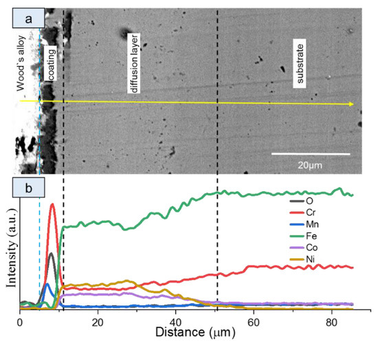 SEM image of cross-section (a) and element distribution (b) of the δCo/δMn = 1.5/0.5 µm coating after the heat resistance test. The yellow arrow indicates the line along which the EDX spectra were collected and their direction.