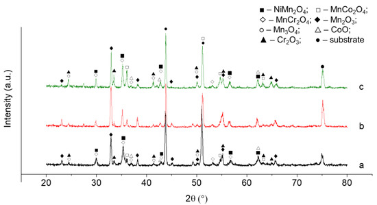 XRD data given in Figure 3 indicate that the coating consists of a mixture of manganese, cobalt, and nickel oxides (NiMn2O4, MnCo2O4, and MnCr2O4) formed during oxidizing annealing. Thus, the layer-by-layer electrodeposition of nickel, cobalt, and manganese, followed by vacuum and oxidizing annealing, makes it possible to form a coating containing phases with a spinel structure.