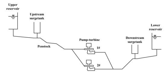 where eqy, eqω and eqh are the transfer functions of turbine flow rate on guide vane opening, speed and head, while ey, eω and eh are the transfer functions of turbine torque on guide vane opening, speed and head. The structure of the pump-turbine and penstock is shown in Figure 1.