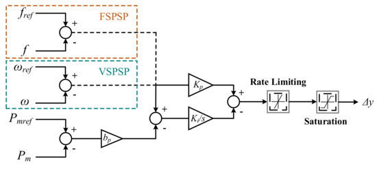 The models of speed governors include a PI controller and two nonlinear components (saturation and rate limiting). For FSPSPs, the input of the PI controller is the deviation of system frequency, while for VSPSPs, the input is the rotational speed of the pump-turbine [19,26]. The equation of PI controller and block diagram of speed governors are respectively shown in Equation (3) and Figure 2.