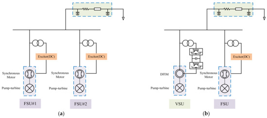 - For regulation performance assessment, Bidgoli et al. built a comprehensive model of VSU connected to a single machine infinite bus system and a two aera power system [22]. The dynamic behaviours of VSPSPs were studied under various operation modes (generating, motor), and comprehensive evaluations were conducted in terms of frequency regulation, fault condition, damping characteristics, harmonic distortion and so on [22]. Yang and Yang adopted four indicators to assess the power regulation performance of VSPSPs [19]. Relevant results revealed that VSUs outperformed FSUs under every selected scenario, while the excitation system and power stabilizers of FSUs were not considered. Yao et al. focused on the operational efficiency of VSPSPs and proposed a novel steady-state model for the stability analysis of VSPSP [23]. Martinez-Lucas et al. evaluated the fatigue risk of penstock in VSPSP through computational fluid dynamics simulations and concluded the effects of variable-speed operation [24].
