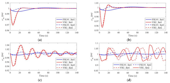 Quantified assessments about Figure 6 are listed in Table 2 and Table 3. Indicators are composed of settling time (Ts), overshoot (Os), peak time (Pt) and maximum deviation of rational speed (Dw). Ts and Pt can clearly demonstrate the performance of response reaction, while Os and Dw are relevant to the oscillation amplitude. The simulation time is set to 140 s and the mark ‘>140’ means the oscillation cannot converge to the pre-set error range during the simulation time. The cells marked with ‘Divergent’ indicate that divergent oscillations are observed under the scenario and settling time cannot be calculated. For the two situations above, the ratio is meaningless and is marked with ‘\’. According to the definition of the indicators, the ratio, which is more than 100%, indicated that the performance of VSU is inferior to FSU.