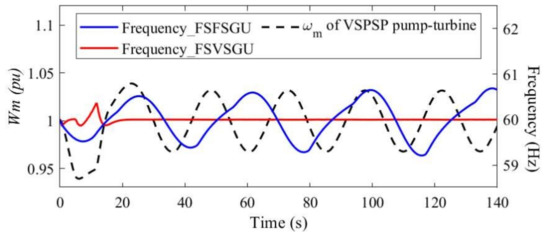 Section 4.1 reveals that ULFO occurs on the system frequency of FSUs and ωm of pump-turbines in VSUs. The regulation performance of the pump-turbine rotational speed in FSUs is equivalent to the frequency stability of the power system. However, the system frequency of VSUs is decided by rotor speed and frequency of field current according to the operation mechanism of DFIM. Thus, the oscillation of rotor speed cannot affect the frequency of the power system, which explains the potential of VSUs for suppressing ULFO of system frequency.