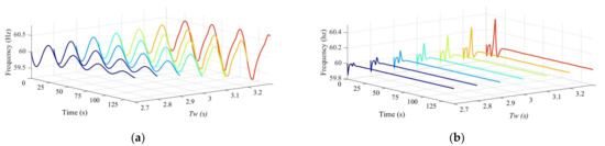 Figure 8 depicts the dynamic response of system frequency of F-FPSP and F-VPSP when Tw increases from 2.7 s to 3.3 s. The transition of F-FPSP system frequency from damped oscillation to divergent oscillation is depicted in Figure 8a. Undamped oscillation occurs at Tw =3.1 s, which can be seen as a critical value of system stability. The amplitude and frequency of oscillation are 0.454 Hz and 0.03 Hz, which corresponds with the features of ULFO.