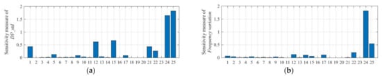 As Figure 9 shows, hydraulic system, speed governor and pump-turbine have a prominent influence on the assessment results for F-FPSP. The dominant parameters for DP_std and relevant ranking are: eqy1 > Tw > eh1 > Ki1 > Kp1, while for frequency variation, the results are: Tw > eh1 > eqy1 > ey1 > Ki1 > Kp1. The sensitivity results of F-VPSP are reverse compared with F-FPSP, as shown in Figure 10. The rank of influential sensitivity index for DP_std is: Kif > Kpf > Xd > Ka > Tw > T’do > T″do and for frequency variation, the rank is: Kpf > Kif > T″do.