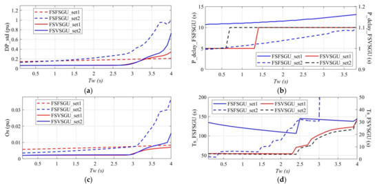 For all four simulation groups, FSU#1_Set1 is the only group that retains stable when Tw increases to 4, while the adjustment speed is fairly slow. Adjustment speed increases as bigger parameters are applied, as shown in Table 3. However, undamped and divergent oscillations occur after Tw increases to 3 and 4, and settling time is larger than 140 s for FSU#1_Set2 and VSU_Set2. The sudden increase of Pt in FSU#1_Set2 and VSU_Set2 at Tw = 4 s is the result of the occurrence of divergent oscillation.