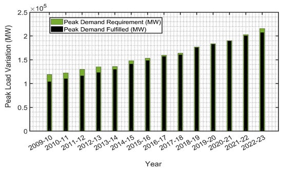 The continuous modernization of societies has increased electricity demand. Penetration of renewable energy in the grid has led to improper scheduling of power [1,2]. One of the reasons for improper scheduling of power is inaccurate load forecasting. A detailed analysis of variation in peak electricity demand is shown in Figure 1 [3]. As can be seen from Figure 1, India’s peak power consumption is always rising, and this is the case for all emerging countries. The ability to meet peak demand has also increased, which can be accounted for by accurate load forecasting and efficient power management [4,5]. The increase in demand has forced the power system operators (PSO) to move away from conventional methods to predict load. The emergence of machine learning techniques has helped power system operators to predict load using various stochastic approaches. In some recently reported work, machine learning methodology is used to solve outage management problems in power distribution systems [6].