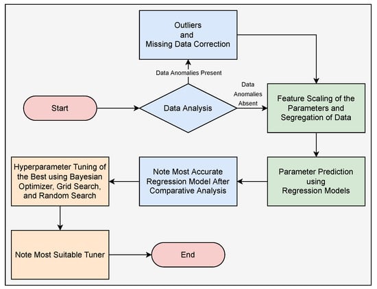A detailed flow chart of the proposed methodology is shown in Figure 2. It can be observed from Figure 2 that to select an accurate STLF model, data are first analysed and outliers are removed. Feature scaling of data is performed to normalize the independent variables of the data. After data analyses and feature scaling, data are trained using regression models such as SVM, Ensemble, Decision Trees, Neural Networks, and GPR. The best regression method is obtained by analyzing statistical parameters such as RMSE, MAE, MSE, , and Prediction Speed. The best method is further optimized with the objective of minimizing MSE by tuning hyperparameters.