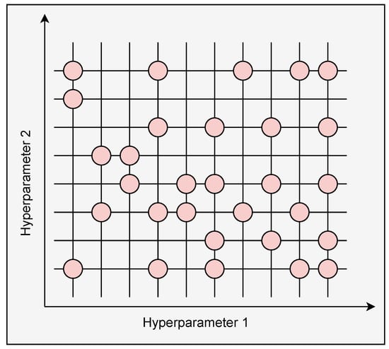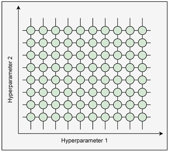 Grid Search is the most commonly used method in hyperparameter tuning. Firstly, a set of hyperparameters is formed. If there are too many hyperparameters, some are eliminated based on their importance. The dominant hyperparameters are then combined to form sets and are plotted in the form of a grid. Then, each combination is tested and the most optimum combination is obtained as a result. It is considered an exhaustive algorithm as it checks all possible combinations of the system. The operation of the algorithm is slow because of this exhaustiveness. Checking each point can be complicated and costly. However, the accuracy obtained from this method can be high. A demonstration of the Grid Search algorithm with two hyperparameters is given in Figure 7. It can be observed from Figure 7 that, when two hyperparameters are plotted, every single value is considered