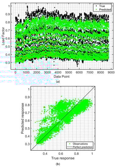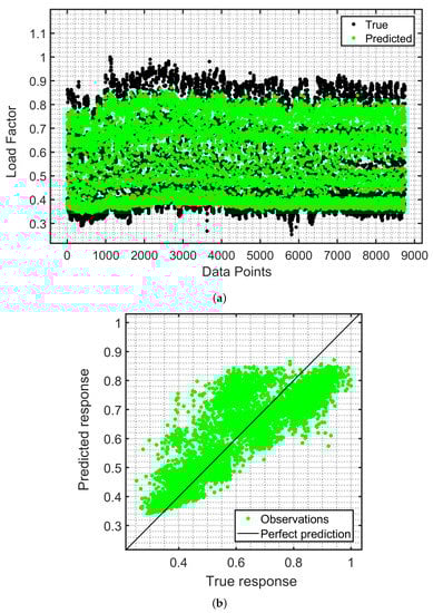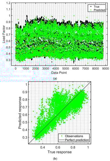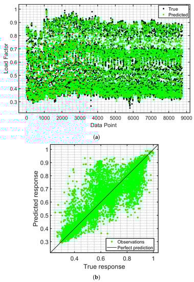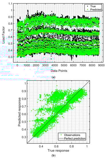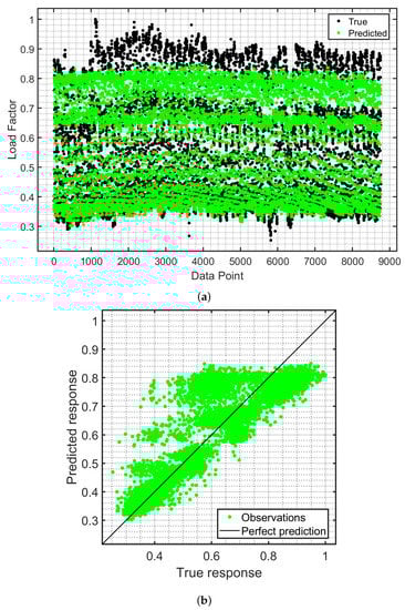 The proposed methodology has been implemented using the data set given in [31]. The electricity supply company of the Malaysian city of Johor generated these hourly load data. This data set shows the variation of load corresponding to day, month, year, time and temperature. The best correlation factor is obtained from combining all the input parameters to obtain the output. A combination of all input parameters is 93.8 percent correlated to the output. The methods have also been tested using the data of [32,33] with similar input parameters. While investigating the data, it was found that around 2.5% of the data set was outliers. These outliers were removed. The output load data were scaled between 0 to 1 with the base quantity as the peak value. Hold-out validation was used with 80 and 20 for testing and training, respectively. The data set was trained with algorithms consisting of Ensemble, DTs, Neural Networks, SVM, GPR, and Linear Regressions. The output of DTs is shown in Figure 9. Figure 9a represents the true versus the predicted values of the system, and Figure 9b indicates how fit the model is and is used for the calculation of . If there is an overfitting issue, it has been crosschecked using cross-validation, replacing it with hold out validation. Similarly, the corresponding results of Linear Regression, SVM, Ensemble, GPR and Neural Networks are shown in Figure 10, Figure 11, Figure 12, Figure 13 and Figure 14, respectively.
