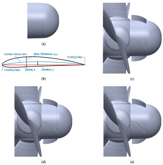 New boss cap and propeller with base design of representative airfoil PBCFs. (a) New boss cap facilitating fin installation. (b) Airfoil—terminology and dimension. (c) Base design of PBCFs of profile 1, AH-6-40-7. (d) Base design of PBCFs of profile 4, E63. (e) Base design of PBCFs of profile 6, NACA4412.