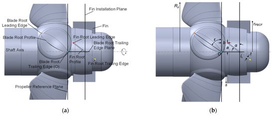 The model-scale propeller with rectangular PBCFs, in which all the key terminologies and design parameters are visually indicated. (a) Definition of profiles, axes, planes, and points. (b) Key PBCFs sizing and installation parameters.