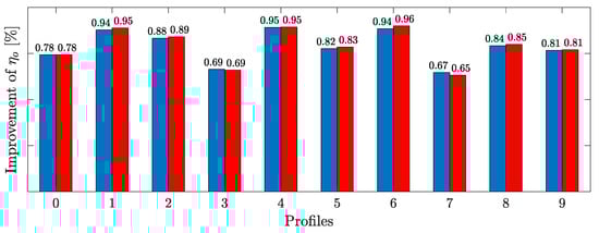 Propeller efficiency increase () by implementing different profiles as the PBCFs in the base design: under the same advance ratio and rotational speed (blue bar, on the left in each pair) and under the same thrust (red bar, on the right in each pair).