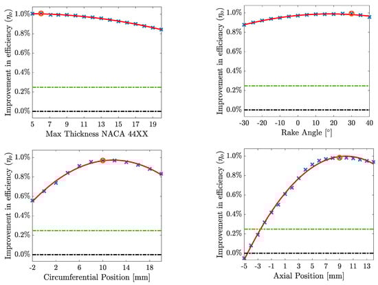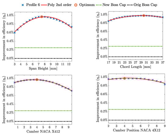 Figure 7 shows the effects of the key PBCFs dimension, shape, and installation parameters on the efficiency gains of the model-scale propeller/rudder system under the design operating condition. The propeller under study has a diameter of , a blade root pitch angle of , and a boss cap base diameter of .
