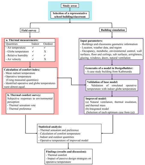 The flow chart presented in Figure 1 shows the methodology used in this study. These methods include field surveys and building simulations. The survey collected environmental quantities and thermal perceptions of students for the evaluation of thermal conditions as well as building information to develop a base model for simulation purposes. Subsequently, the impact of individual passive design strategies on operative temperature was evaluated. According to the literature review, we found that some studies employed an overlay of single optimal technology while running the simulation [,], and this study also used such technology. The base model was generated referring to a case study school, which is a representative school found around the Kathmandu valley and other places located in the temperate climates of Nepal []. The case study building has a similar structure, form, and materials as other school buildings.