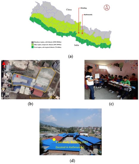 Nepal has a varied climate, owing to its geography and altitude. It is divided into three topographic regions: the Himalayan north has a cold climate, the hilly middle has a temperate climate, followed by the subtropical Terai south. The most dominant climate type is temperate, characterized by a dry winter and hot summer. Figure 2a shows the location of the investigated areas in a temperate climate region on the map of Nepal. The outdoor air temperatures in this area generally decrease in October and reach their minimum in January. June to September have the hottest temperatures, most rainfall, and highest humidity (70–83%) []. Field studies were conducted in three school buildings: one in Kathmandu (S1) and two in the Dhading district (S2 and S3). However, the focus of this study was on the S1 school building for simulation and depth analysis. Figure 2b–d shows a view of the case study school S1. It is a one-storey uninsulated, pitched-roof building with its main façade facing south, which is naturally ventilated by keeping windows and doors open, and no mechanical equipment is installed. The external walls are fabricated of bricks, and the inner wall surfaces are finished using plaster and mortar. It is a private secondary school building and representative of the commonly found school buildings around Kathmandu and other places in Nepal [].