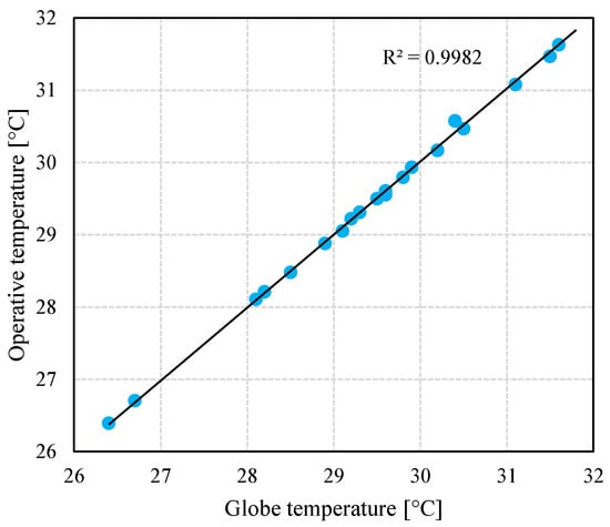 Moreover, the adaptive comfort model suggests judging the indoor thermal comfort of a naturally ventilated space using operative temperature []. We measured the air velocity only during the voting time, so the operative temperature could not be calculated for the whole-day lesson period. Using the voting time measurements of indoor air temperature, indoor globe temperature, and air velocity on the survey day (28 May) in S1 building, the operative temperature was calculated. Figure 5 shows the correlation between the indoor globe and operative temperature, which indicates that they are equal. Bradshaw [] reported that the globe temperature is approximately the same as the operative temperature. Kazkaz and Pavelek [] found that the globe temperature is equal to the operative temperature (less than 0.6 K) in the range of air velocities higher than 0.2 m/s and the difference in MRT and air temperature is less than 10 K. This implies that globe temperature and operative temperature can be used interchangeably. The differences in MRT and air temperature in the case study classroom at 11:00, 13:00, and 15:00 were 0.2 °C, 2.2 °C, and 0.3 °C, where the five-minute average air velocity was recorded automatically by the data logger as 0.20 m/s, 0.32 m/s, and 0.38 m/s, respectively. Many studies [,] found that the globe and operative temperatures were numerically equal; therefore, we chose the operative temperature for the thermal comfort analysis.