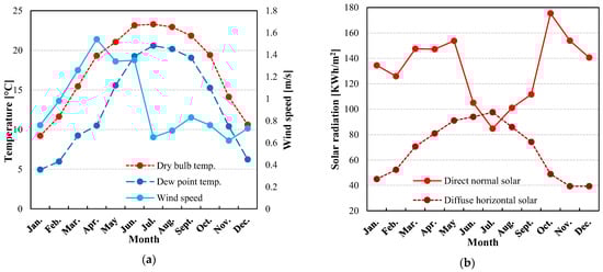 Monthly average values of climatic data in Kathmandu: (a) outdoor temperature and wind speed and (b) direct normal and diffuse horizontal solar radiation.