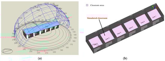 Three-dimensional view of the simulation school building model (S1): (a) sun path diagram and (b) zones. No urban setting was included in the model.