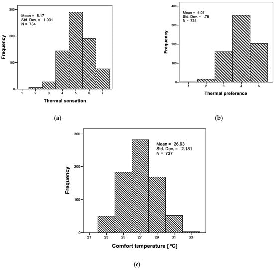 Overall distribution of (a) thermal sensation, (b) preference, and (c) estimated comfort temperature.