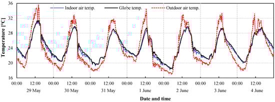 The average comfort temperature, as found in Section 3.2, was 26.9 °C. The average comfort temperature appears to be close to both the average school-hour (10:00–16:00) indoor air temperature (28.0 °C) and the globe temperature (28.1 °C). However, the indoor globe temperatures are higher than 28.0 °C, and improvement is needed to reduce them.