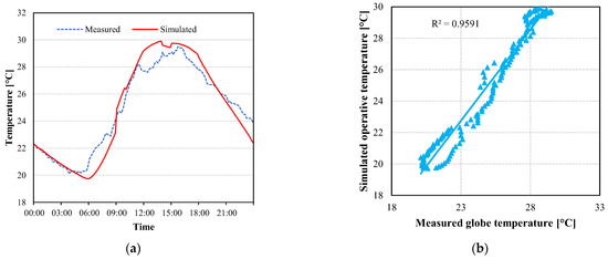 Validation of the base model: (a) variation (b) relationship between the measured globe and simulated operative temperatures on 4 June 2019. A few other studies [,] used measured indoor air temperature and simulated operative temperature to validate models.
